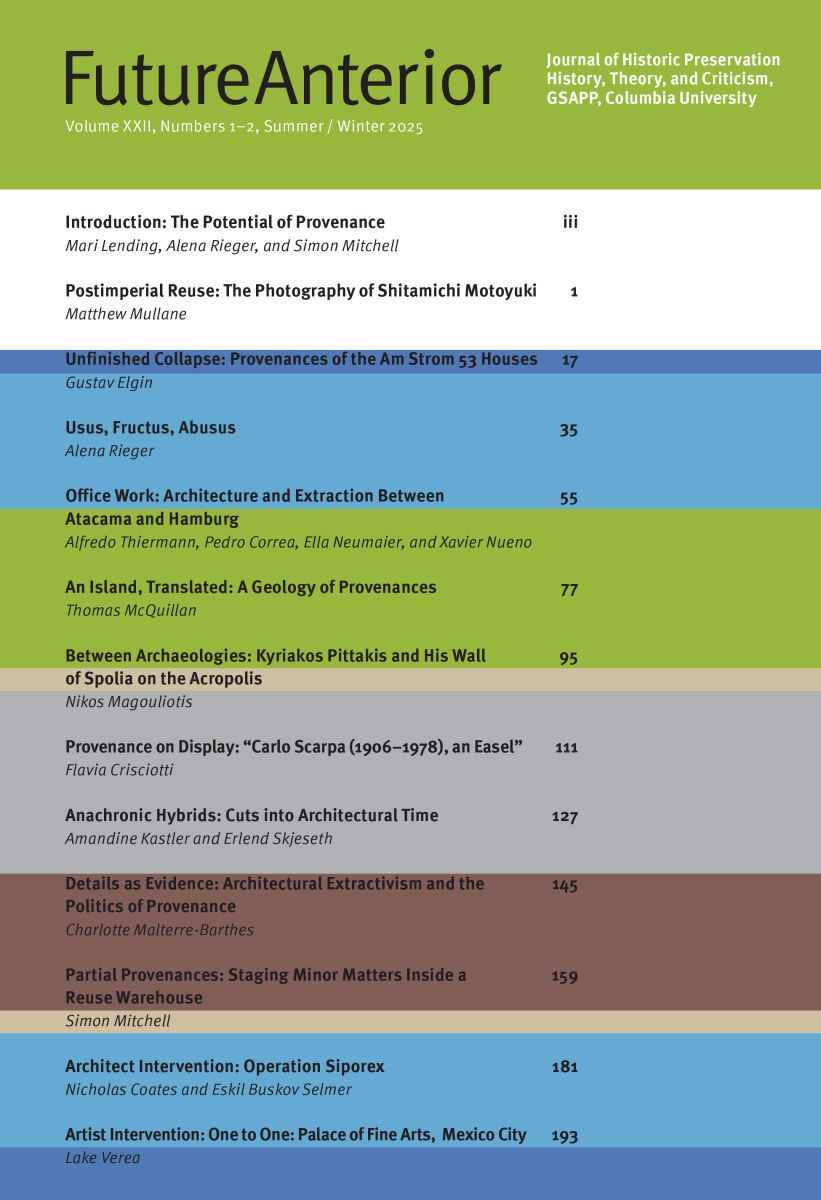 Wherever there is a transfer of anything ascribed value, there is provenance: on coffee beans, clothing tags, in the art market, on the construction site. Change requires stability, and provenance, at its most basic and ideal, aims at stabilizing claims of ownership and authorship in anticipation of possible transactions. As many previous editions of Future Anterior have shown, buildings as well as monuments are mutable, movable, and replicable. With this collection we bring together scholars, practitioners, artists, and educators who use provenance to look at transfers, misuse, adaptation, and reinvention across geographies and chronologies. These essays are not linked by a single topic like material reuse or restitution, but united by a way of seeing: Provenance here becomes a lens, a practice, a historical orientation.