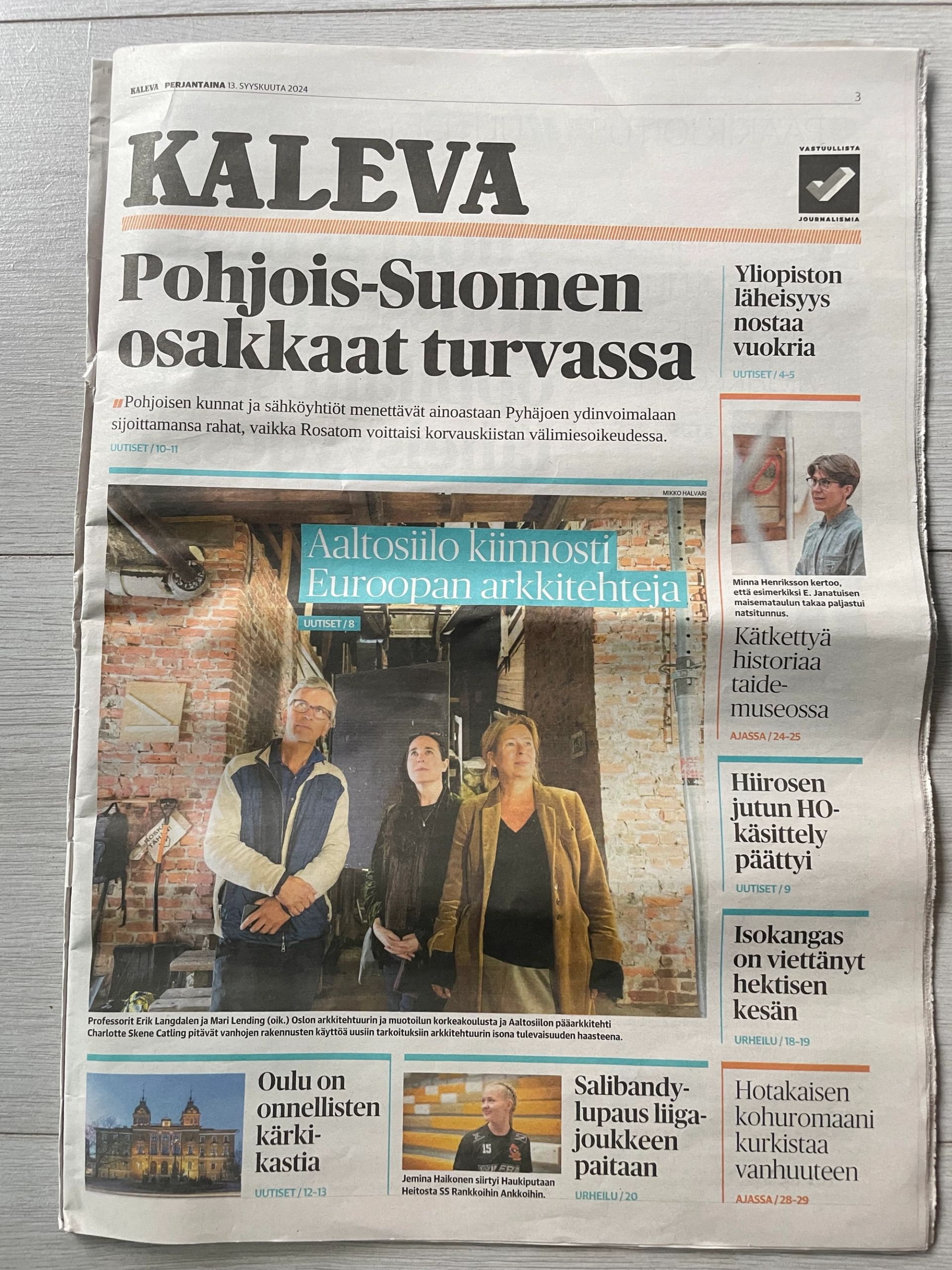 Mari Lending and Erik Langdalen are giving the double keynote lecture “Values: Architecture Past and Future in the Era of Circularity” at the three-days European Commission Visit in Oulu, Finland, part of the EU program Living Spaces – Cities and regions shaping the built environment for everyone, followed by the Aaltosiilo Festival 2024: “The Post-Industral Dance”, on Saturday September 15.