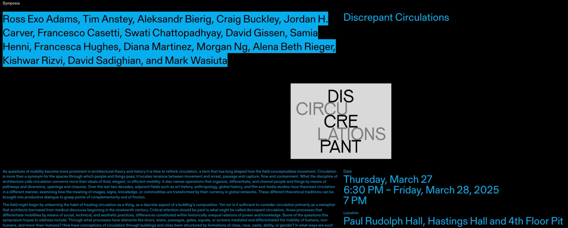 Organised by Craig Buckley, at the Art History Department, Yale University, Discrepant Circulations looks at the differentiation of mobilities in architecture by means of social, technical, and aesthetic practice. At a critical moment for academic discourse in the US, this timely one-day symposium considered how concepts of circulation are being transformed by changing techniques for the opening and closing of boundaries; how they set people, information, and things in motion, and conversely, how they may bring them to a halt.